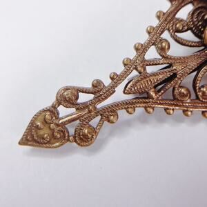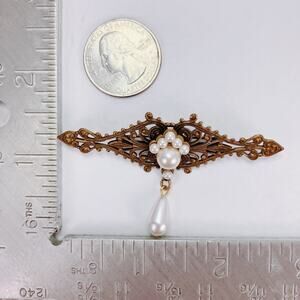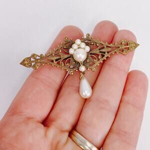 Victorian Revival filigree brooch in warm gold tone with a faux-pearl cluster and teardrop dangle. A slim navette silhouette and lace-like openwork echo 19th-century jewels.