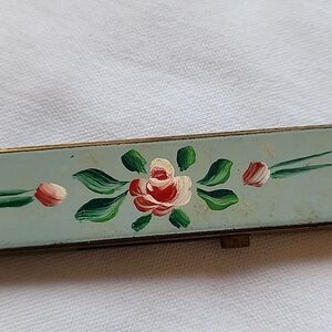 A beautiful and feminine piece for your Vanity, costume, collection or use. Tortoise patterned comb inside a brass and enamel case with handpainted florals