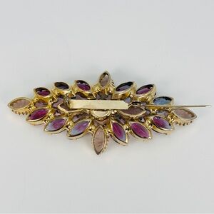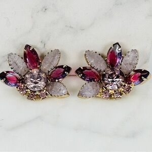 This beautiful vintage rhinestone demi-parure includes a brooch and matching clip-on earrings in a stunning mix of amethyst purple, lavender, and frosted pink stones. The navette (marquise) and round-cut rhinestones are securely set in gold-tone metal with classic dog tooth prongs.