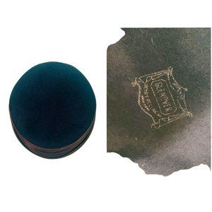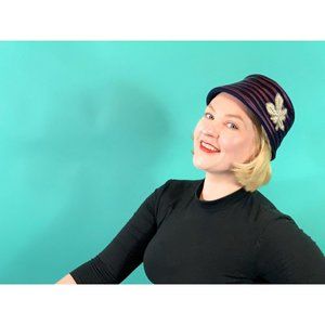 A vintage 1950s bucket hat in a navy blue with a red-toned purple satin stripe trim. Has a gray and white sequin floral detail on the side.