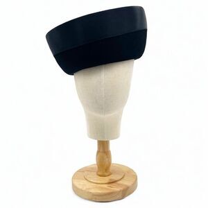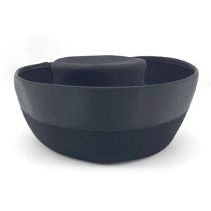 This is a fine quality velour hat designed in the Breton style by Carol during the mid 1950s. The hat has a crown with upturned brim as is typical of the Breton shape. The edge of the brim is decorated with a wide satin ribbon around its entirety with a matching box bow at its nape.