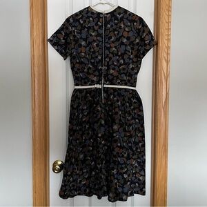 EUC stunning floral printed vintage dress from Carol Brent. No size tag but I would guess this would best fit a modern size 6. Measurements included. Contrast trim around the neckline and the waist. The front near the waist may have had buttons at one time but you could add some if you’d like. Metal zipper. No stains or flaws!