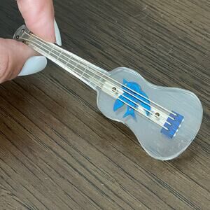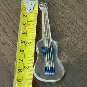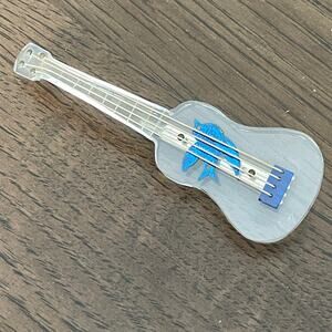 Vintage 1940’s-1950’s carved clear lucite/ acrylic guitar with strings & painted with a blue bird brooch pin costume jewelry