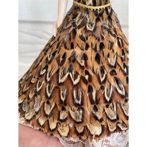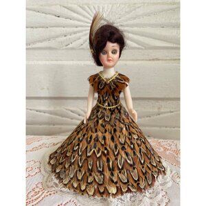 Charming vintage 1950s doll crafted from celluloid and dressed in a unique pheasant feather dress, adorned with delicate lace trim. A beautiful collector's item with a nostalgic feel. This doll is 8" doll. She has no damage and is in great displayable condition.