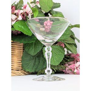 Stunning single clear crystal champagne glass or sherbet dish featuring a faceted stem and platinum trim. This vintage crystal glass is part of the Montclair pattern set produced between 1953 to 1979 by Tiffin-Franciscan. This beautiful wide pedestal crystal glass is an elegant choice for fine dining and holiday entertaining. The glass measures approximately 5.5" tall and 4.25" diameter at its rim. An excellent addition to any mid century modern MCM dining set. Crystal tablescape. The glass is in excellent vintage condition with no chips, cracks or scuffs. Only normal wear for a vintage item.
