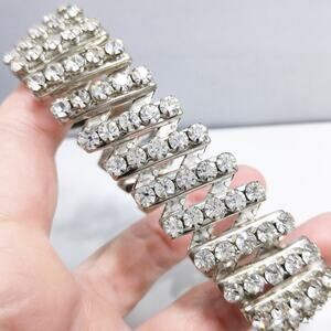 *Description: This is a beautiful clear rhinestone expansion bracelet, five rows of clear crystals, on a silver tone background from the 1950s. All rhinestones are in place and full of sparkle. Each are prong set. Gorgeous vintage bracelet!