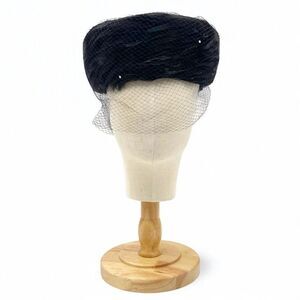 Vintage 1950s Coralie Feathered Pillbox Hat Black Velour with Veil & Rhinestones