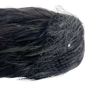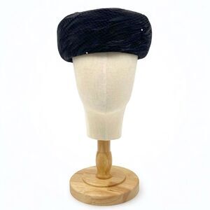 This elegant vintage 1950s pillbox hat by Coralie is a sophisticated statement piece. The hat features a luxurious black velour base, adorned with soft black feathers arranged in a swirling pattern. A delicate black net veil drapes over the face, accented with small rhinestone embellishments for a touch of sparkle.