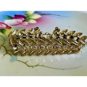 This stunning vintage bracelet from Coro features intricate gold-tone leaves adorned with sparkling rhinestones. A timeless piece, ideal for collectors. This bracelet measures 6 3/4" long and almost a 1/2" wide. There is a safety change on this piece. There is some wear on the inside and one stone is a little cloudy. Otherwise in good wearable vintage condition.