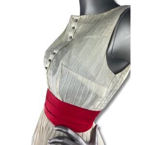 Vintage 1950s Cream Day Dress. The skirt has a black flocked print and red cummerbund style waist band. The bodice has pin tucked striping with little metal set crystal Buttons (ornamental). No label.