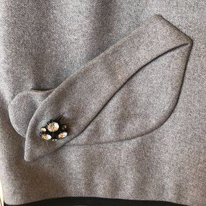 Vintage 1950s gray wool skirt suit by legendary designer Dan Millstein has interesting, surprisingly hip details on jacket and skirt. Decorative buttons (two on jacket, one on skirt) have lost some of their rhinestones, but can easily be replaced. This was Great Aunt Eve's suit and probably hasn't been worn since the 1960s. Recently dry-cleaned. A rare find.
