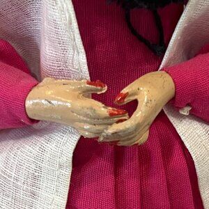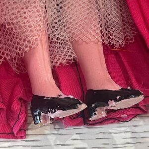 Glossy hard plastic face with dramatic makeup and braided yarn hair. Her Sombrero is straw with metallic thread and her dress is pink with a net underskirt.