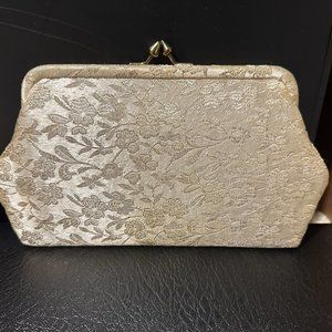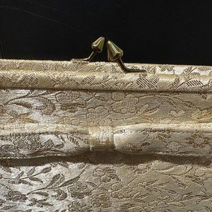 Material: Bag: Cream satin with gold flower brocade. Color looks more gold than in cover photo. (see third picture where purse is angled to see better color and close up to see shine of brocade)
