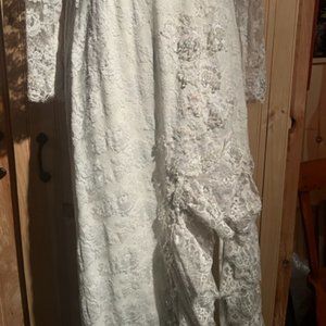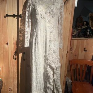 I'm so excited to offer this incredible and authentic Tur Zel vintage custom wedding dress! The dress has a high collar that is adorned with delicate rose printed lace and accented with clear crystal embellishments. In fact, the entire dress is carefully covered with the delicate rose printed lace and dripping with crystals in all the right places to truly make this dress a way to transform the bride into the vision of elegant beauty.