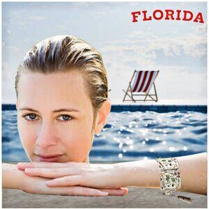 This vintage bracelet features panels showcasing the state of Florida, painted in colorful enamel on aluminum. The cuff style bracelet measures 9 inches in length, making it a statement piece with a unique design. Made in Japan, this piece of vintage jewelry captures the charm and nostalgia of a bygone era, perfect for adding a touch of retro flair to any outfit.