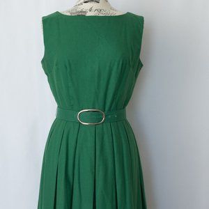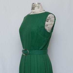 Luscious forest green dress in a cotton twill. The dress features a boat neckline with box pleats in the skirt. The dress is accessorized with a matching green belt.