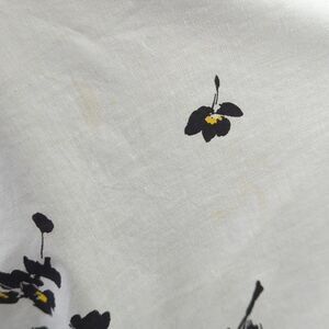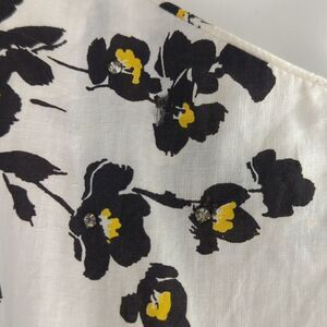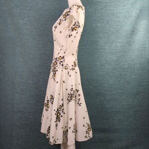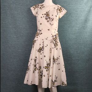 Authentic 1950s Georgiana white cotton drop waist dress with black and yellow floral pattern, with rhinestones in the flower centers. The dropped waist is accented by piping around the seam, and there's a little tiny bow, offset toward the left side. The full circle skirt is not pleated. It has a boatneck neckline, short sleeves, and a fitted bodice with side zipper.