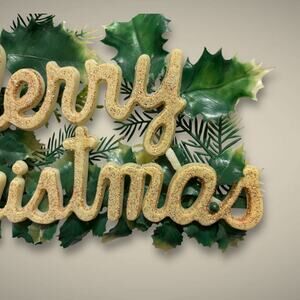 Vintage 1950s Gold Glitter “Merry Christmas” Plastic Sign with Poinsettias