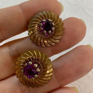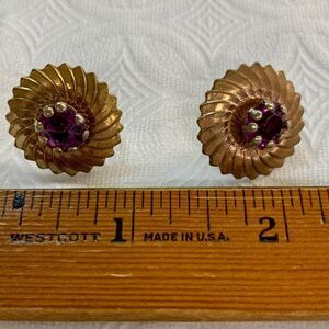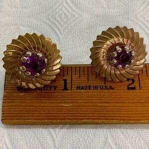 Vintage 1950s Gold Purple Plum Rhinestone Floral Screw Back Earrings (J179)