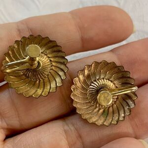 I have tried to show all sides of these lovely earrings. I have tried to photograph size by photographing them alongside of a ruler. Any blemishes due to natural aging are naturally shown in the photo. These are lightweight. These are in wonderful Gently Used Condition. Please do not hesitate to ask me any questions you may have concerning their condition.