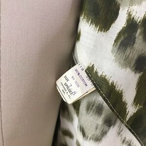 This lovely dress by Spiegel is made of 100% cotton and has a built in crinoline out of a stiff paper like material. There's a gathered bow waistline that wraps around to the back. Metal back center zipper in white. The paper tag is still present which means this is new old stock or at least has never been cleaned/washed. Abstract floral print in white and sage green.