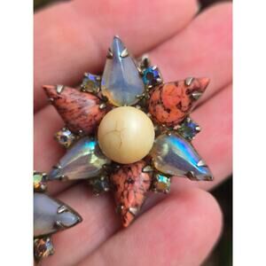 Features trios of orange with black veins Art Glass Teardrop cabochons alternating with trios of iridescent white opal teardrop cabochons set fringe style below a row of small clear aurora rhinestones and a champagne colored simulated Pearl center.