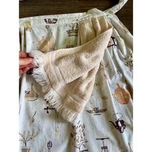 Vintage 1950s Half Apron Novelty Print Kitchen Knick Knacks Attached Hand Towel . Go back in time with this 1950s novelty printed cotton half apron. It is made from a novelty printed cotton of kitchen items and florals. It has a rare attached hand or dish towel, sewn into the waist. There is a pocket. It is lightly faded with age but there are no holes, tears, or stains. Please view all photos prior to purchasing, sold as is.
