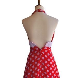 Excellent vintage pre owned condition. Vintage 1950's Handmade Red & White Polka Dot Halter Ankle Length Dress. Hook and eye halter closure. White trim. empire waist. V neck. Fit and Flare skirt. Fully lined. Back hidden zipper. Not fully zipped on mannequin.