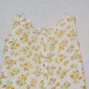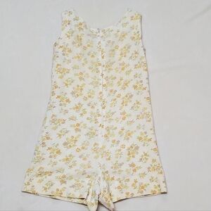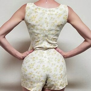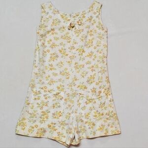 Vintage 1950s Handmade Yellow Floral Woven Linen Side Pocket Shorty Romper.