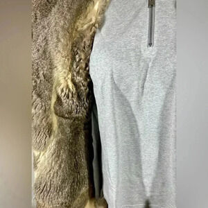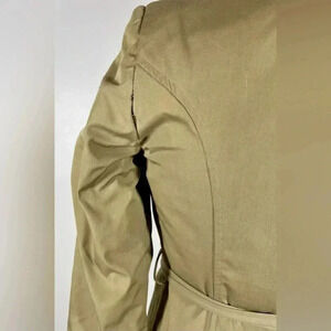 Exterior trench fabric has misc stains/marks on shoulder, upper sleeve. Trench coat has belt to cinch. Collar is a pop collar that is fully fur lined. Interior is fully fur lined with the exception of sleeves. Coat falls to mid thigh (or lower if you are shorter).