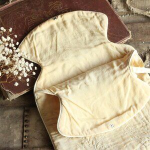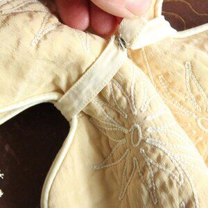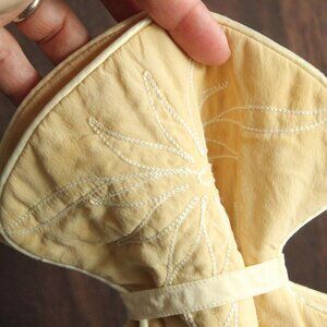 Darling vintage hot water bottle cover circa the 1950s, give or take a bit either way. Yellow with white floral embroidery. Fully lined, it has a snap that closes up the top and a strap with another snap that wraps around the neck. Looks and feels like rayon to me. No label. Measures about 15.5" at the longest and about 9" wide.