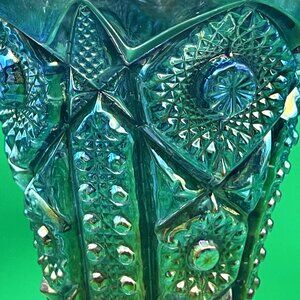 This vintage 1950s Imperial Carnival Glass vase features a beautiful daisy and button pattern in a vibrant green color. A beautiful example of mid-century carnival glass, this piece features the iconic Daisy & Button pattern in a rich iridescent green. The glass shimmers with vibrant hues of blue, purple, and gold, making it a captivating decorative item. With a flared design and crimped rim, this collectible piece of art glass is a perfect addition to any mid-century modern décor. Made in the United States during the 1950s, this decorative vase stands at 6.5 inches tall and showcases the production technique of collectible carnival glass. Ideal for collectors or those looking to add a touch of retro charm to their home.