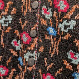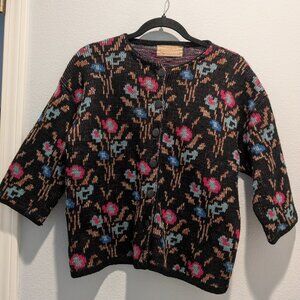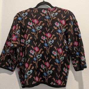 What a gorgeous sweater and so vintage!!! In excellent condition. It has 3/4 sleeves and is black with flowers. There is a metallic thread weave throughout the sweater design that makes it so noticeable. This is a heavy sweater, most likely a wool blend.