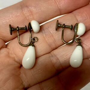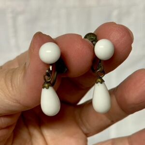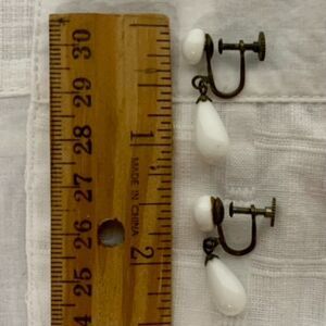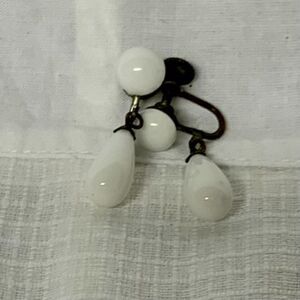 Vintage 1950s Japan Screw Back Earrings White Milk Glass Dangles (J281)