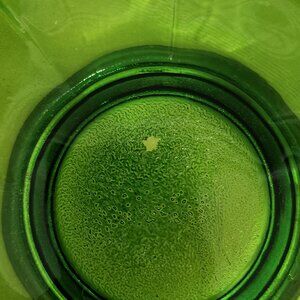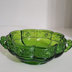 This vintage 1950s Green Jeanette Class Company Bowl has roses embossed and a pretty scalloped rim. Also has two handles. In very nice vintage condition. It has one small speck on the bottom of the bowl, where the green coloring is gone. See my photos. Bowl is 6 and one quarter inches with handles it is 7 and a quarter inches by two and three quarter inches tall. Non smoking pet free home. @ ER Left Box #1
