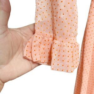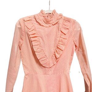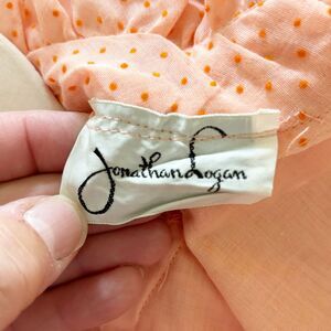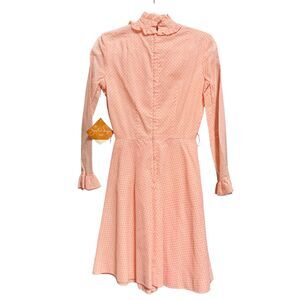 A stunning mid-century treasure from Jonathan Logan, this peach-pink cotton dress captures the charm of the 1950s with its romantic ruffled neckline and delicate allover polka dots. Crafted from soft dacron polyester with a flattering fit-and-flare silhouette, it’s detailed with a high ruffle collar, long sleeves, and a back zipper. Belt loops are included (belt not present). A timeless and feminine piece perfect for collectors or vintage enthusiasts alike.