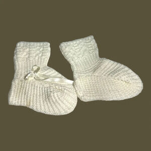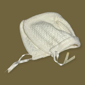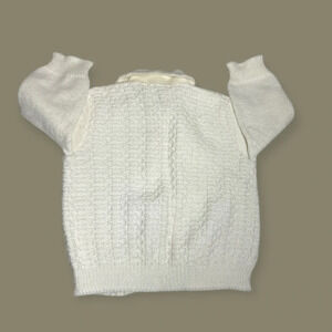 It includes a sweater, bonnet, and booties, all in a cream color. The sweater features a button front and a Peter Pan collar.