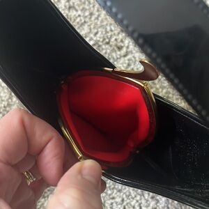 This vintage 1950’s Koret Korettalak patent leather purse is so rare and unique you will fall in love with it. It has a built in change purse with a red interior that snaps closed. The gold details are so pretty!