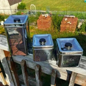 Vintage 1950's Kreamer Ware Metal Chrome Kitchen Canister Set Coffee Tea…