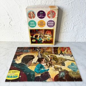 Vintage 1950s Walt Disney's Lady and the Tramp puzzle by Jaymar is complete and in very good vintage condition. Normal wear and tear, mostly to the box which has been taped. Price tag is still on the box, shown in photos. Over 60 pieces. We put puzzles together before reselling to ensure they are complete. Pieces stored in resealable bag.