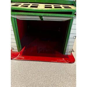 This is used but in good shape. Box shows some shelf wear and has light discoloration. The garage is complete and the door works well. Light marks from use on the tin paintwork. The car is roughly 7" long. The wind up motor works. The car is missing the top as seen in photos. Inside has some adhesive and sticky black that should clean up.