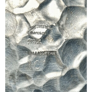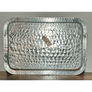 Tray is mid century modern from the 1950s. It is hammered aluminum with a rose imprint. The imprint is hand painted. There are a couple places were the paint had worn off.