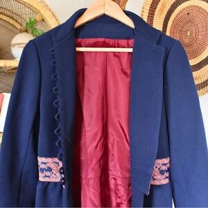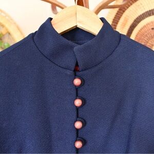 Vintage 1950s mega mod knit coat by Domani knits. Navy twill double knit over coat with jacquard paisley details, mandarin collar and loop button closures.