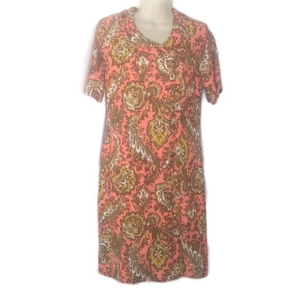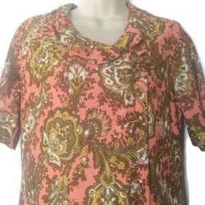 Gorgeous Coral Dress with Brown and Cream Paisley Floral Pattern, Buttons in Front at Side with Peter Pan Collar and Flower Design Button At Top, Lined.