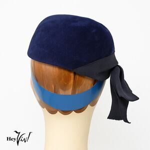 Vintage 1950s Navy Blue Felt Velour Hat w Wide Grosgrain Ribbon Bow - Hey Viv