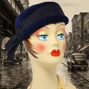 Vintage 50s Navy Blue Felt Velour Hat w Wide Grosgrain Ribbon Bow
