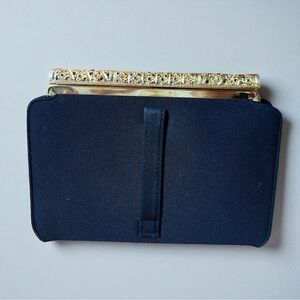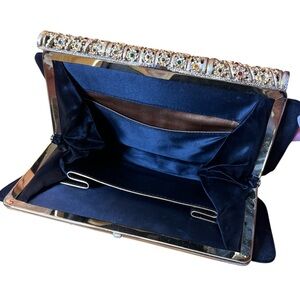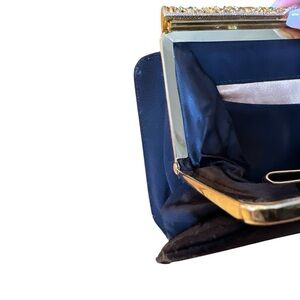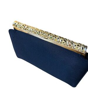 Glamorous, unique black evening clutch. The purse features a structured, gold-tone frame adorned with an intricate filigree pattern and multicolored rhinestone gems. While approx 7 or so gems are missing and there is some light fraying at the corners of purse, the overall condition is still good, with a clean interior making it a perfect piece for a collector or for adding a classic accent to your formal attire.