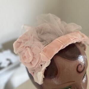 50s floral fascinator, pink rose hat, vintage wedding headpiece, midcentury fashion, soft pastel hat, collectible millinery, romantic retro style, bridal veil hat, feminine vintage accessory, classic garden party piece