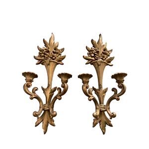 Vintage 1950s Pair of Syroco Wood 2 Arm Wall Sconces Gold Gilt Hollywood Regency