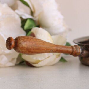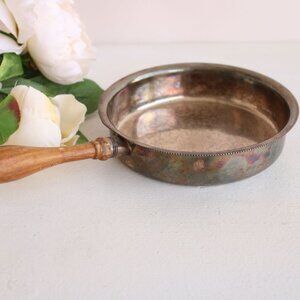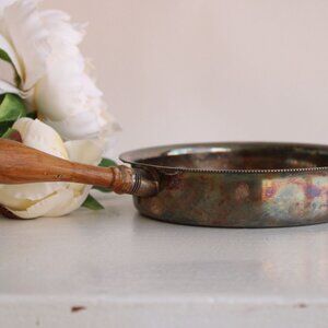 Lovely little silent butler by Sheffield Silver Co circa 1950s. Silver plate over copper. Marks on the back are EPC with 3 symbols including a crown, and the number 3000. Please see photo. Stands just over 1.25" tall and is just shy of 6" in diameter at its widest, not including the handle. Handle is 4.5" long, and wood.